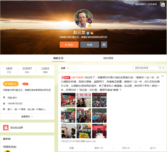 谈及发出该微博的初衷,赵云龙说:“临近春节,我首先想到了付出辛苦劳动的志愿者。另外我也希望更多的人参与到春节感恩活动中,对父母、同事表达感谢之情。”